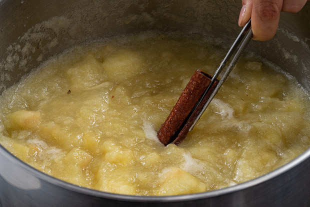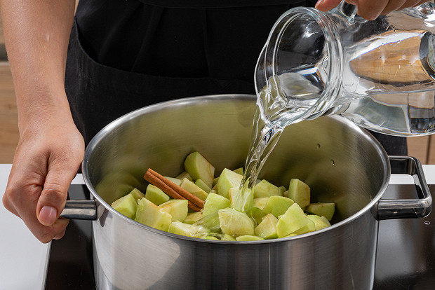 Переложите яблоки в кастрюлю, залейте водой и варите с палочкой корицы примерно 30–40 минут на небольшом огне.