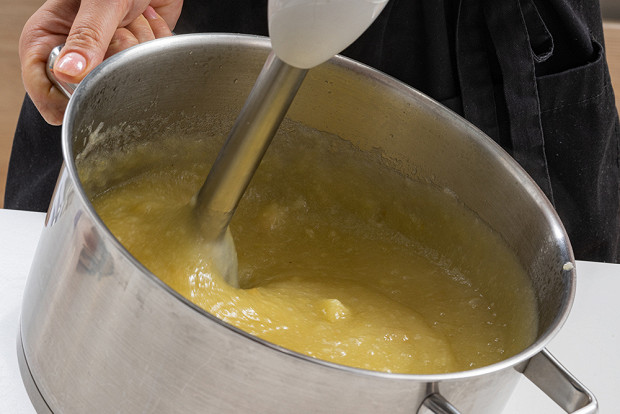 Не сливая воду, пробейте содержимое кастрюли блендером.