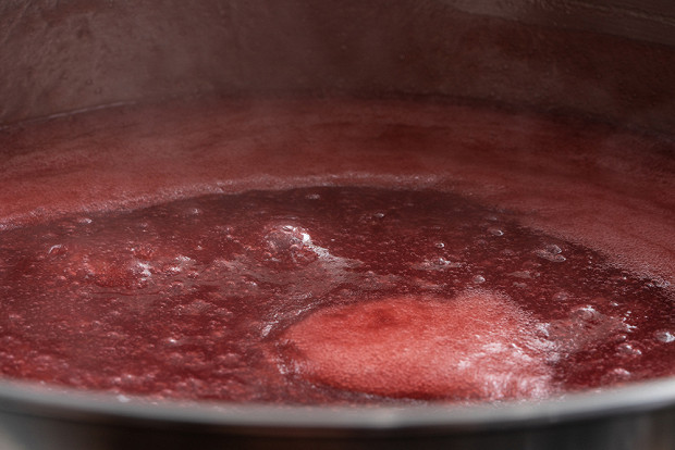 Добавьте в кастрюлю сахар, вино, лимонный сок и сок смородины.
