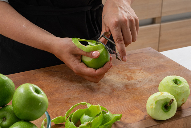 Нарежьте яблоки. Очистите яблоки от кожуры и семечек, если вы хотите получить более жидкую текстуру, напоминающую кисель, оставьте кожуру и семечки, если вы хотите, чтобы холодец был более крепким.