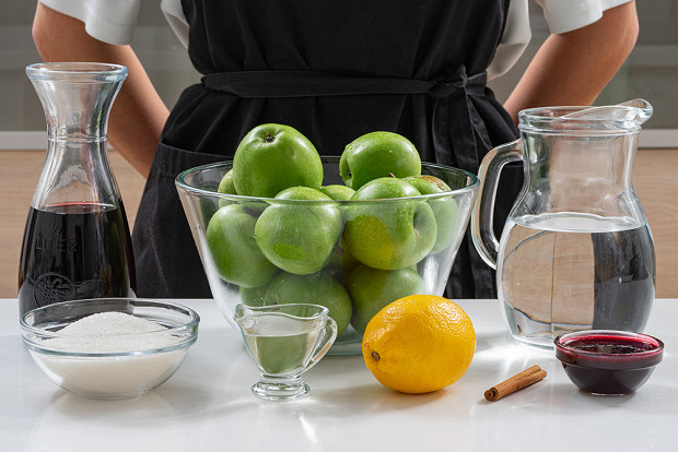 Подготовьте все ингредиенты: 1,2 кг яблок (берите зеленые кислые яблоки — в них больше пектина), 700 мл воды, 400 мл красного вина, 30 мл белого вина (но можете ограничиться одним видом), 200 г сахара, 30 мл лимонного сока, 60 мл сока черной смородины (смородиновый сок можно выжать из замороженных ягод или заменить его смородиновым вареньем), 1 палочка корицы.