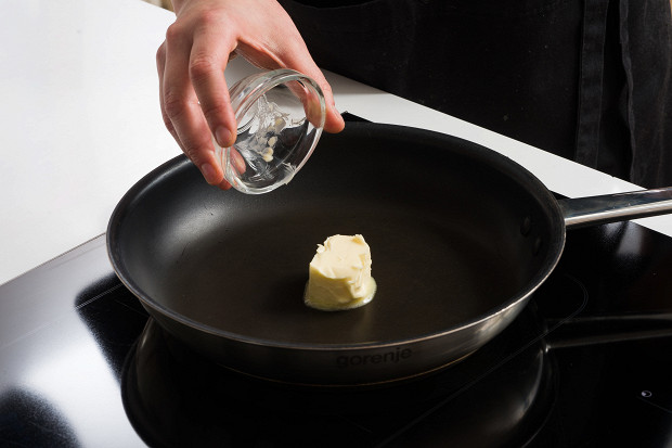 Разогрейте сковороду на среднем огне и растопите на ней 15 грамм сливочного масла. Сковорода может быть любой — с толстым или с тонким дном, поскольку готовка яичницы — дело быстрое и не требует высоких температур. Если же вы не уверены в том, что вам удастся готовить строго на среднем огне, тогда добавьте к сливочному маслу несколько капель растительного — так сливочное не пригорит, и яичница не пострадает.