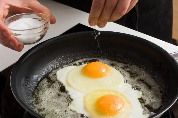 Посолите и поперчите яичницу по вкусу. Солить можно в любое время — хоть в начале жарки, хоть на тарелке. А вот добавлять перец лучше в конце — иначе он утонет в белке.