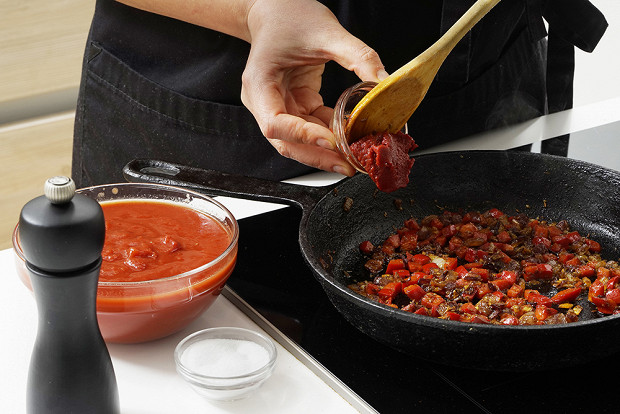 Подготовьте все ингредиенты. Мы делаем эту шакшуку зимой, а потому решили усилить томатный вкус и, за неимением сладких свежих помидоров, соединили вместе пасту и консервированные помидоры, нарезанные кусочками.