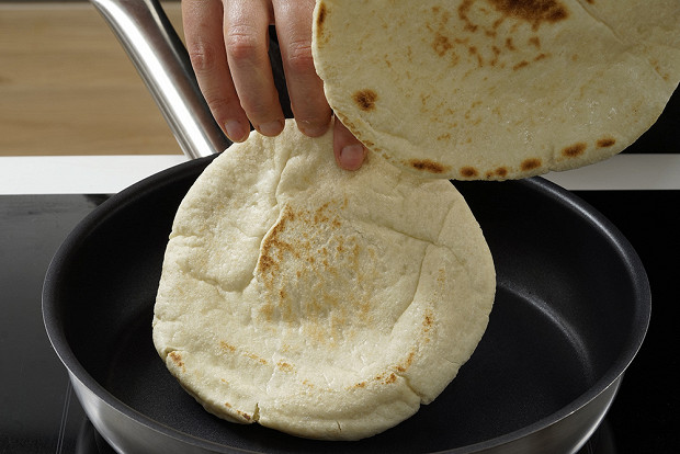 Традиционно шакшуку подают с лепешкой или питой, которую по-хорошему следует сначала подержать на сухой раскаленной сковороде. Если же питы нет, то поступите так же с любым другим белым или серым хлебом.