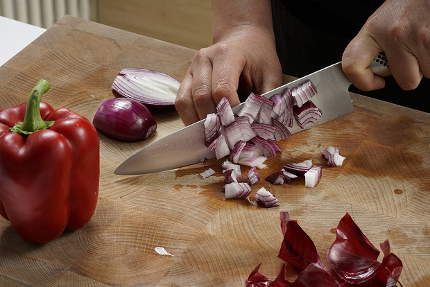Нарежьте кубиками одну луковицу и отправьте лук на сковородку вместе с 30 мл оливкового масла. Мы использовали красный лук: он сладкий и здорово сочетается с помидорной кислотой. Но, если у вас под рукой есть какой-то другой лук — белый репчатый или шалот, смело используйте его.