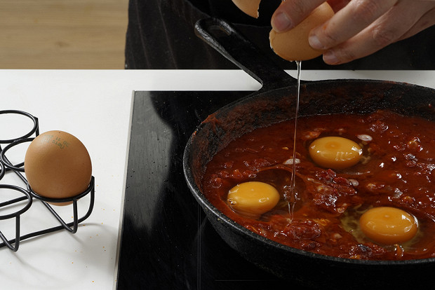 Тщательно перемешайте содержимое сковородки, сделайте в соусе небольшие лунки и разбейте в каждую по яйцу — сюда гармонично впишутся 4 штуки.