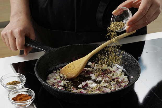 Добавьте специи: чайную ложку зиры, половину чайной ложки копченой паприки и столько же орегано. Добавьте специи к луку — из-за тепла и соседства с маслом приправы быстро отдадут свой вкус и аромат.