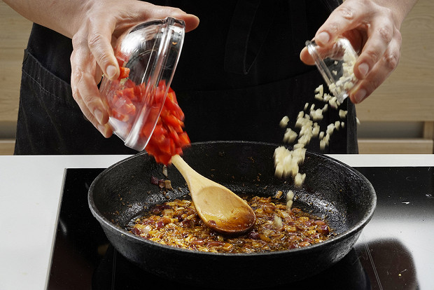 Когда все поджарится, добавьте туда чеснок и половину красного болгарского перца, нарезанного кубиками. У чеснока другая температура горения, его надо держать на сковородке куда меньше. Перец должен слегка прихватиться и заполучить легкую корочку, которая отдаст свой вкус шакшуке.
