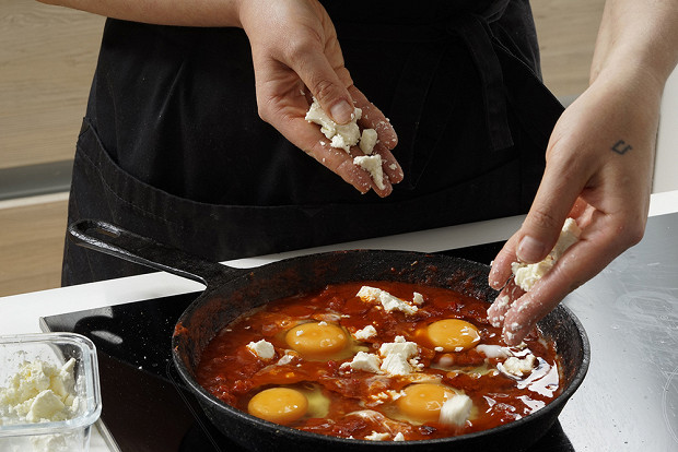 Сверху выложите ломтики феты. Советуем оставить какую-то часть сыра напоследок, чтобы положить ее на готовую шакшуку, уже перед подачей. Отправьте сковородку в духовку на 7–10 минут. За это время яичный белок должен схватиться, а желток остаться жидким. Накрывать сковороду не нужно, иначе яйца покроются белой пленкой. Если у вас нет духовки, то можно приготовить шакшуку на плите, на тихом огне — тогда вам все-таки придется воспользоваться крышкой, чтобы яйца прожарились. При этом способе желток неминуемо покроется белой белковой пленкой, которую можно снять, поддев ее аккуратно вилкой.