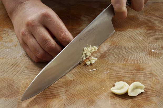 Нарежьте мелко ножом или пропустите через пресс два зубчика чеснока. Если во время чистки окажется, что чеснок пророс и внутри него живет зеленый росток, уберите зелень: она дает сильную горечь.