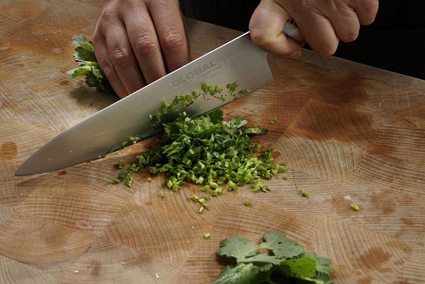 Нарежьте 15 грамм кинзы. Стебли, которые содержат максимум вкуса, можно мелко нарезать, а листья порвать. Количество кинзы можно варьировать — положить больше или меньше. Также ее можно поменять на петрушку, если кинзы нет или если ее запах вам невыносим.
