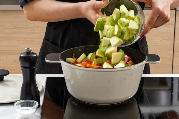 Когда картофель будет готов, добавьте кабачок и тушите еще 3 минуты — этого времени кабачку вполне хватит. Попробуйте и добавьте соль и перец, взятые по вкусу.