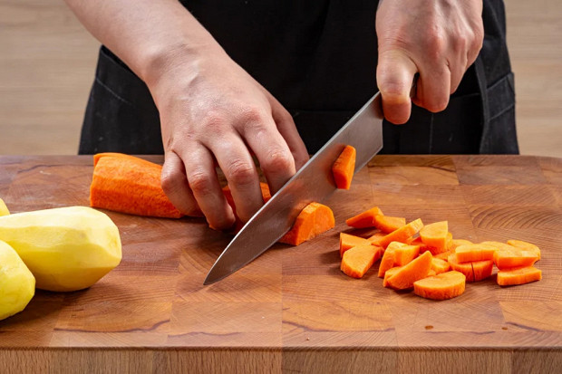 Морковь нарежьте полукольцами. Картофель избавьте от кожуры и нарежьте крупными кубиками.