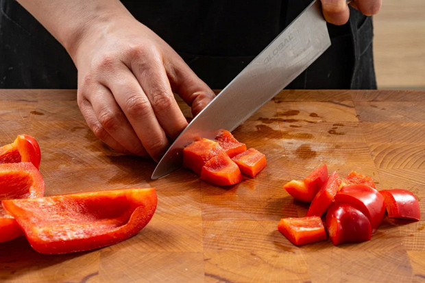 Перец избавьте от семян и нарежьте его крупными кусочками.