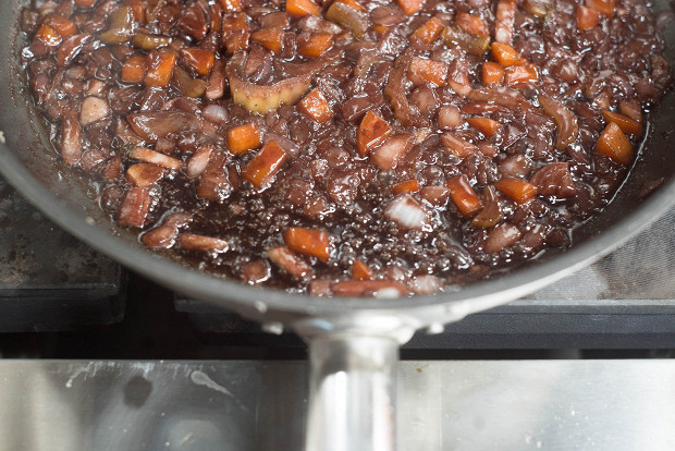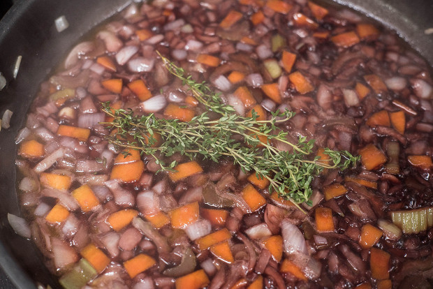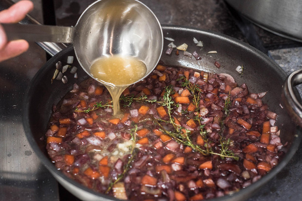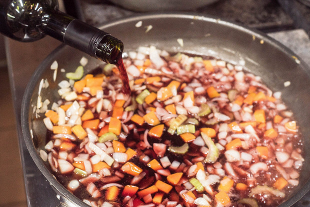 Через 8–10 минут добавляем к овощам красное сухое вино, примерно 200 мл. Вино дает цвет, вкус и ароматику. Запомните: добавлять к еде нужно тот алкоголь, который вам приятно пить. Кислое невкусное вино нам не подойдет, потому что в итоге этот вкус окажется в паштете. Виски или коньяк добавлять при тушении не имеет смысла, спирт испарится, оставив неприятную вкусовую гамму.