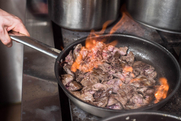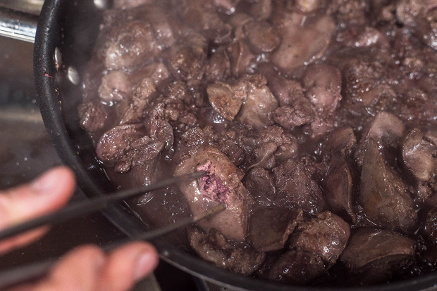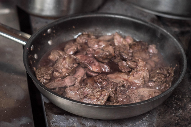 Возвращаемся к печенке. Когда из нее уходит вся жидкость, я поливаю ее грушевым ликером и поджигаю, но вы можете этот этап пропустить. Кстати, с мясом и печенью вообще прекрасно сочетаются фруктовые ликеры, грушевый или апельсиновый. Они делают аромат блюда свежим и насыщенным.