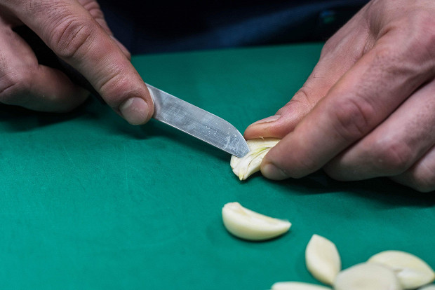Нам понадобится 20 г чеснока. Важно вытащить из зубчиков проростки и стрелки, если они уже появились. Они дадут паштету неприятную горчинку.