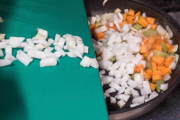 Наливаем в сковороду подсолнечное масло, сначала кидаем чеснок, держим его полминутки, чтобы он отдал маслу аромат, добавляем сельдерей и фенхель, затем морковь, потом лук и начинаем тушить, постоянно перемешивая, чтобы овощи не пригорели.