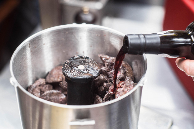 После поджигания (или сразу, как уйдет вся жидкость) заливаем печенку хорошим красным портвейном (100 мл). Я выбираю алкоголь по принципу вкуса и цвета: к мясу добавляю красный, потому что я хочу получить красивый оттенок паштета. К рыбному паштету я бы добавил белое сухое вино или белый портвейн.