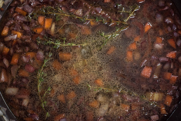 Минут через 10 после тимьяна добавляем к овощам 300 мл куриного бульона, он нужен для вкуса. Прибавляем огонь, чтобы жидкость скорее выпаривалась.