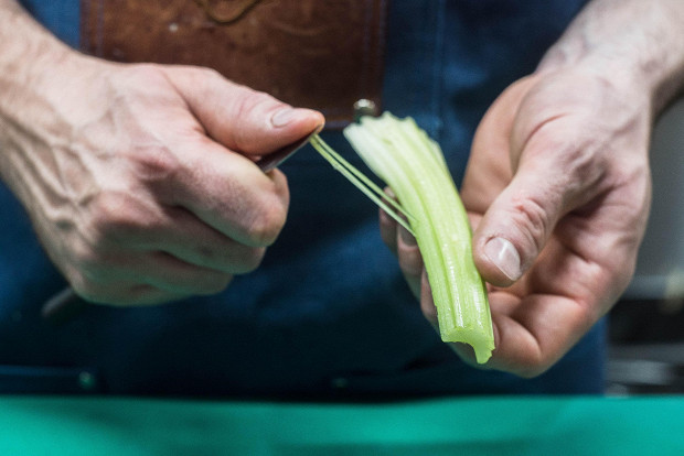 Берем один стебель сельдерея, чистим его от продольных жилок (они очень жесткие, не прожуешь), затем измельчаем. Добавляем лепесток фенхеля (его много не надо, даже один листик придаст паштету приятную пряность) и тоже измельчаем. Если фенхеля нет — не беда.
