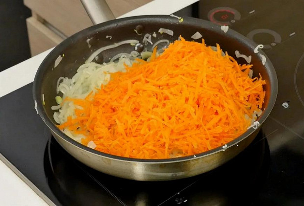 Добавьте в пассеровку морковь и обжаривайте еще 4–5 минут, пока она не станет мягкой.