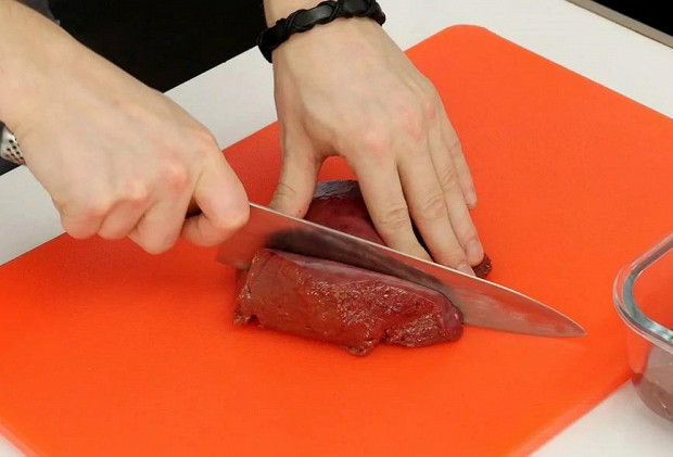 Говяжью печенку (1 кг) очистите от крупных сосудов, жил и пленок, промойте и нарежьте крупными кусками.