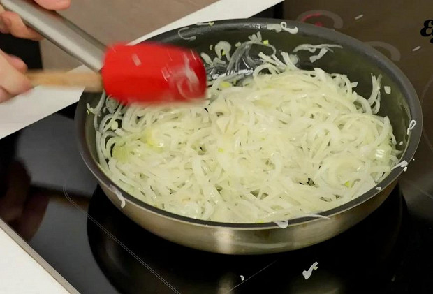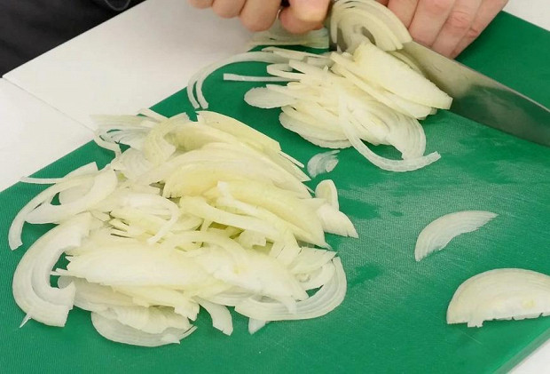 Теперь займитесь начинкой. 2 средние луковицы нарежьте тонкими полукольцами.