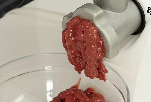 Пропустите печенку через мясорубку или измельчите в кухонном комбайне в однородный фарш.