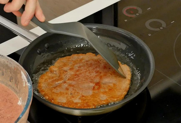 Разогрейте блинную сковороду или сковороду с антипригарным покрытием. Смажьте ее тонким слоем растительного масла (это удобно делать надетой на вилку половинкой картошки) и вылейте половник теста. Распределите его тонким слоем по сковороде и подрумяньте с двух сторон, как если бы вы выпекали блины.