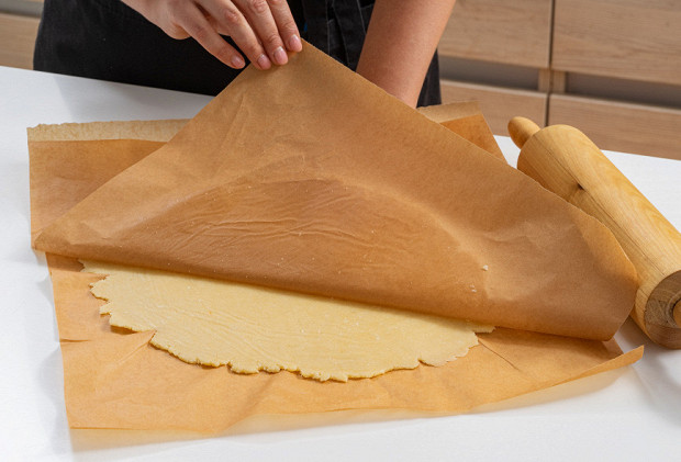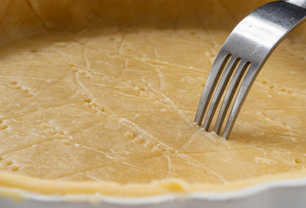 Выложите тесто в круглую форму, плотно уложите его по дну и стенкам, излишки теста срежьте. Наколите тесто вилкой.