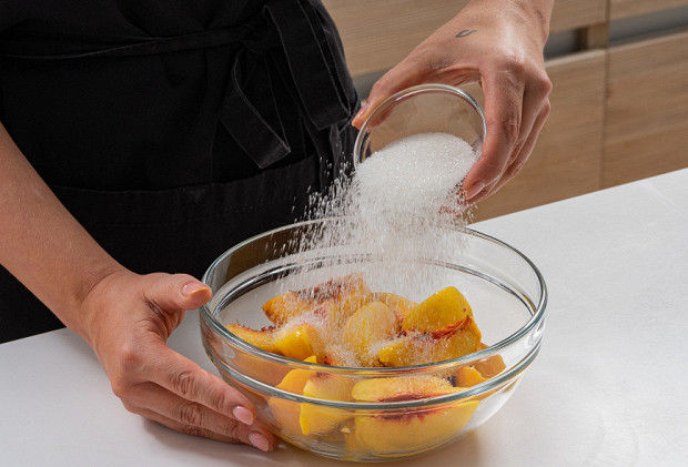 Засыпьте фрукты оставшимся сахаром, оставьте на 10 минут.