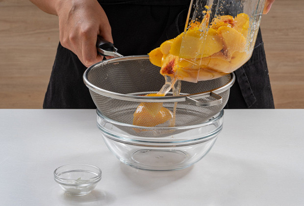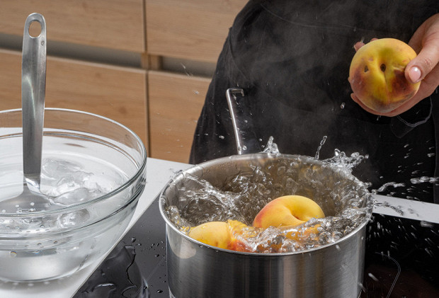 В кастрюле вскипятите воду, бросьте в нее персики на 30 секунд, затем переложите в ледяную воду.