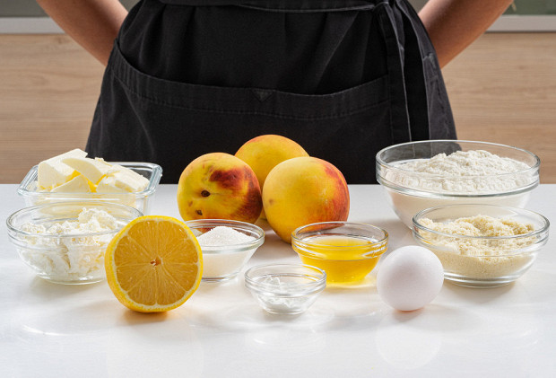 Подготовьте ингредиенты: 500 г персиков, 250 г 9%-ного творога, по 2 cт.л. меда и лимонного сока, 250 г пшеничной муки, 100 г холодного сливочного масла, 60 г миндальной муки, 1 желток, 150 г сахара, 1 ч.л. крахмала, немного соли.