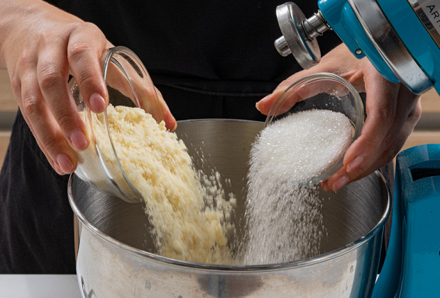 Добавьте пшеничную и миндальную муку, 50 грамм сахара и соль. С таким количеством сахара у вас получится несладкое, очень нейтральное на вкус тесто. Если вы хотите, чтобы тесто было слаще, добавьте еще 30 г.