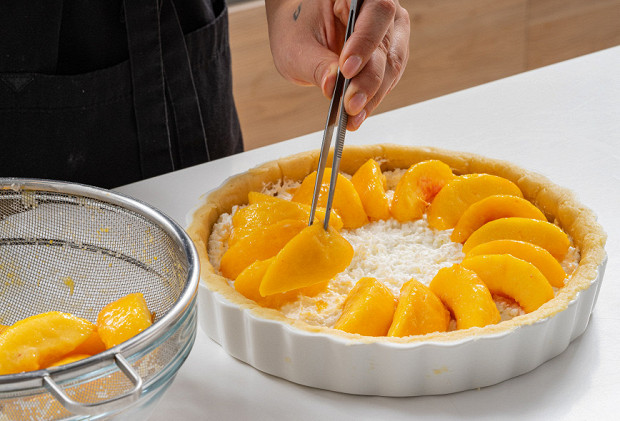 Затем откиньте персики на дуршлаг, дайте жидкости стечь, засыпьте крахмалом и тщательно перемешайте.