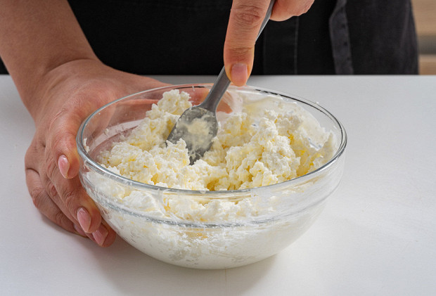 Разомните творог вилкой, чтобы он стал кремообразным. Если персики не очень сладкие, можно добавить к творогу немного сахара, не больше 50 грамм.