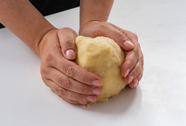 Вымешивайте тесто руками, пока оно не соберется в плотный эластичный ком. Придайте тесту форму шара, заверните в пищевую пленку и уберите в холодильник минимум на 3 часа. Такое тесто можно хранить в морозилке в течение месяца.