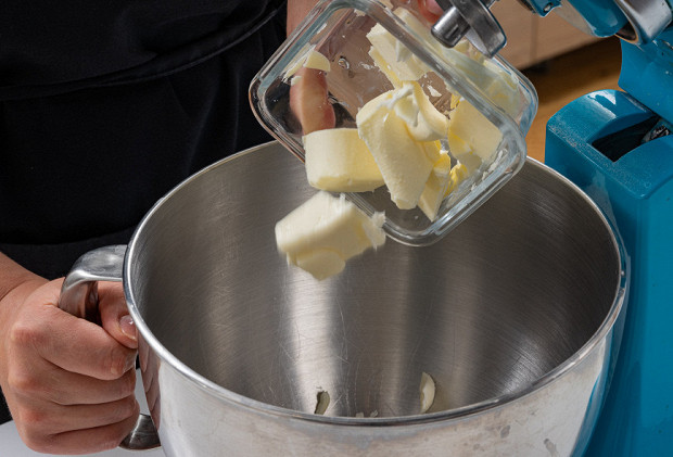 Холодное сливочное масло нарежьте кубиками, положите в чашу миксера.