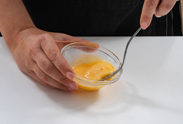 Желток перемешайте в чашке с 4 чайными ложками холодной воды. Влейте жидкость в тесто.