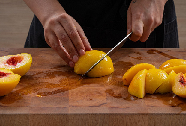 Снимите кожицу с персиков, разрежьте их пополам и вытащите косточки. Если персики крупные, нарежьте их дольками.