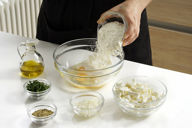 В отдельной миске смешайте лук, оливковое масло, яйца, 5 столовых ложек муки, рубленую петрушку и орегано. Добавьте сыр, еще раз аккуратно перемешайте, стараясь не превратить сыр в кашу.