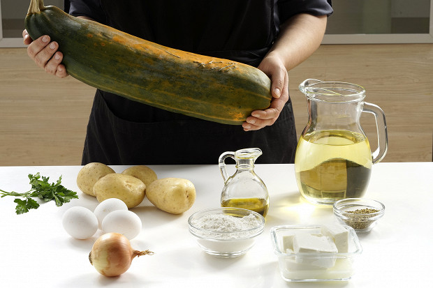 Подготовьте все ингредиенты. На 1 килограмм кабачков вам понадобится 500 грамм картофеля, 1 луковица, 400 грамм брынзы, 3 яйца, 120 грамм пшеничной муки (и в тесто, и для обсыпки), 50 миллилитров оливкового масла и растительное масло для фритюра.