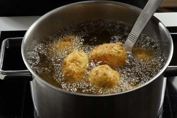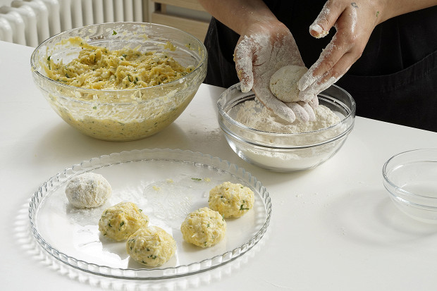 Налейте в толстостенную кастрюлю рафинированное масло и разогрейте до 180 градусов (если нет кухонного термометра, можно проверить нагрев фритюра, кинув в масло кубик хлеба, он должен равномерно поджариться со всех сторон примерно за 30 секунд). Мокрыми руками сформируйте из кабачкового теста небольшие шарики и обваляйте их в муке.