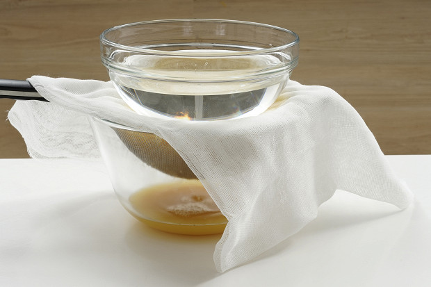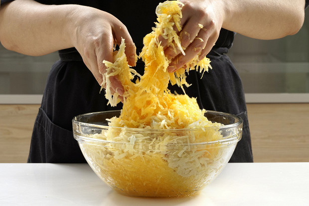 Откиньте получившуюся смесь на сито, накройте марлей, сверху поставьте груз, например другую миску с водой, и оставьте на час, чтобы лишняя жидкость стекла. Если нет времени, то дайте смеси стечь хотя бы 10 минут, потом плотно заверните в марлю и как следует отожмите.