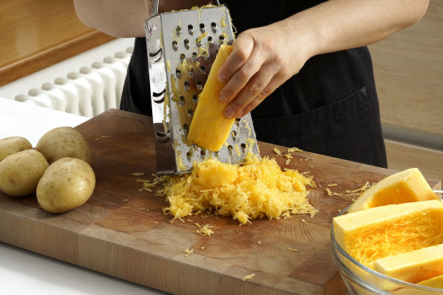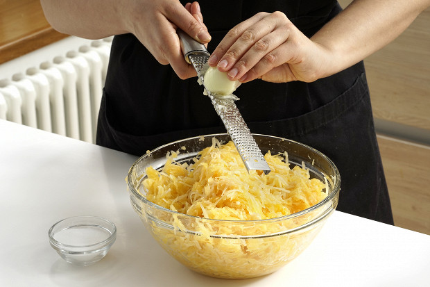 Кабачки и картофель очистите от кожуры. Если кабачок нестарый или вы используете цукини, внутренности можно не удалять. Если внутри «вата» и жесткие семечки, сердцевинку выньте. Натрите картофель и кабачки на мелкой терке.