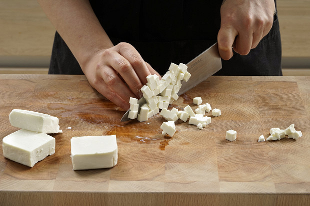 Брынзу нарежьте кубиками примерно в 3–5 миллиметров.