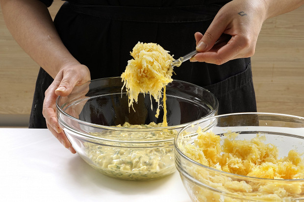 Перемешайте овощную смесь и сырно-яичную. Сделать это одним махом не получится, так что добавляйте тертые овощи порциями, каждый раз хорошенько вымешивая.
