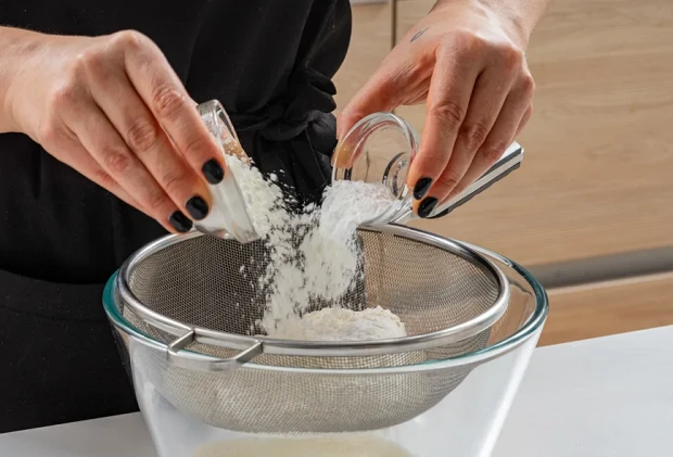 В отдельную миску просейте муку, соль, взятую по вкусу, крахмал и разрыхлитель. Если захочется поэкспериментировать, то незначительную часть пшеничной муки можно заменить, например, черемуховой или миндальной.
